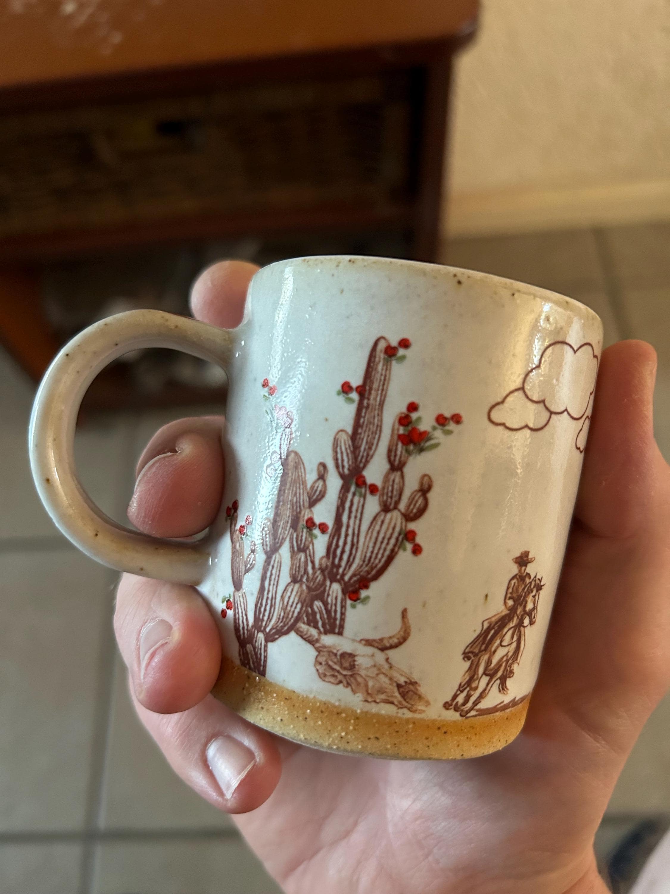 I was very excited when I opened my package. The cup I took out of the box looked even more beautiful in real life than in the picture. Very special is the edge just above the bottom that feels rough while the top is glazed. As if it is real sand from the Wild West 🤠👍 The images speak for themselves so you can see how beautiful the print is both on the outside and the inside. Amazingly detailed. Very inpressive piece of work. That also applies to it’s weight. It is robust and solid material but light easy and light in the hand. A pleasure to drink from. My mother thought so too and she could not resist drinking my coffee unnoticed. The size of the espresso mug is completely perfect for me and certainly also for a European amount of coffee that is slightly smaller than an American. The seller is very friendly and helpful.