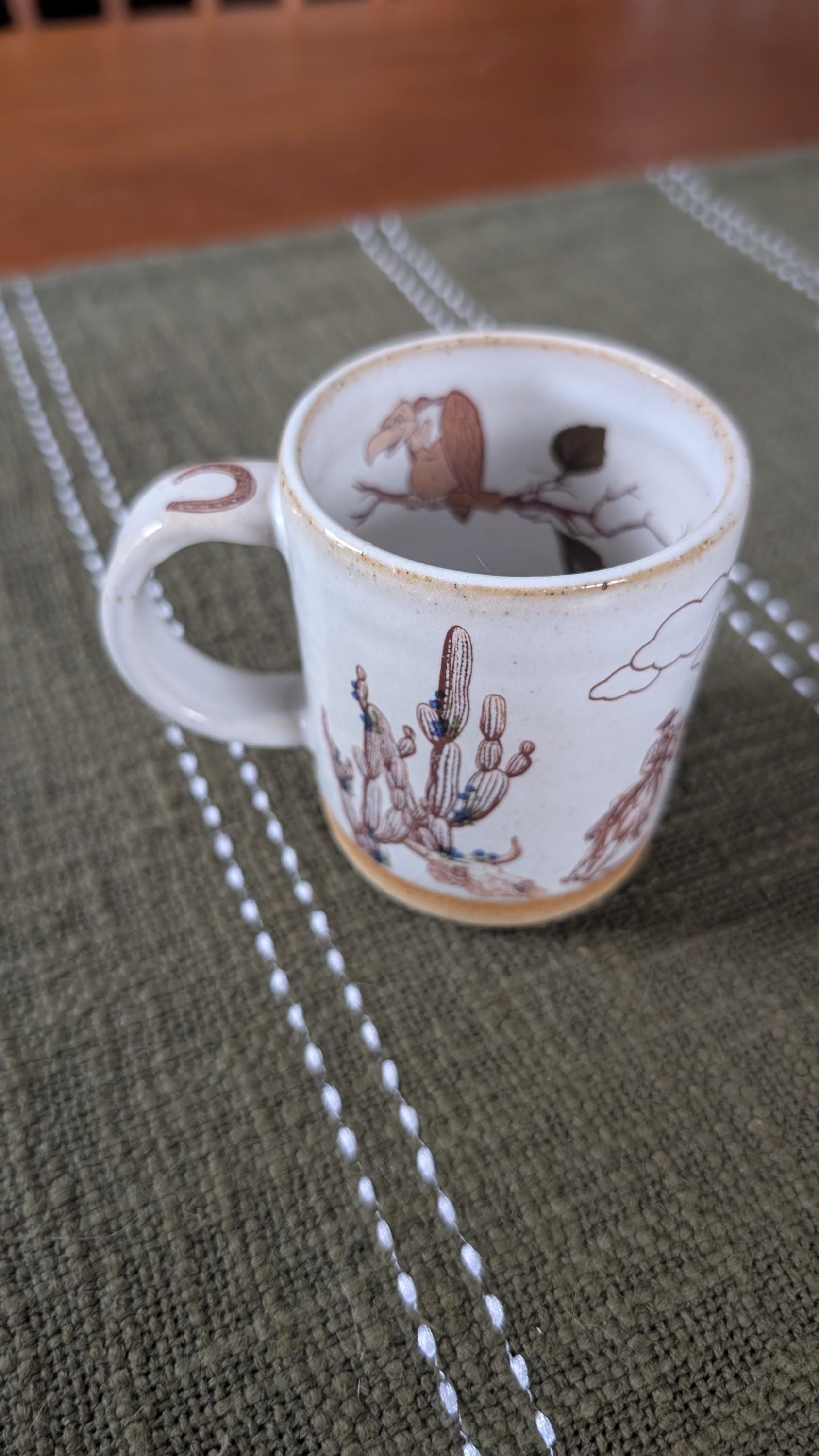 Giddy Up little doggies! It’s the Wild West! Have an espresso and go on an adventure! Each mini mug is unique and an original work of art. Hand thrown, hand glazed and meticulously hand decorated. Fired 4 times in the kiln to achieve its distinctive look. Microwave and dishwasher safe. Made with love and care in the Bohemian Cat House on Lake Champlain in Vermont. Easily holds a double espresso.